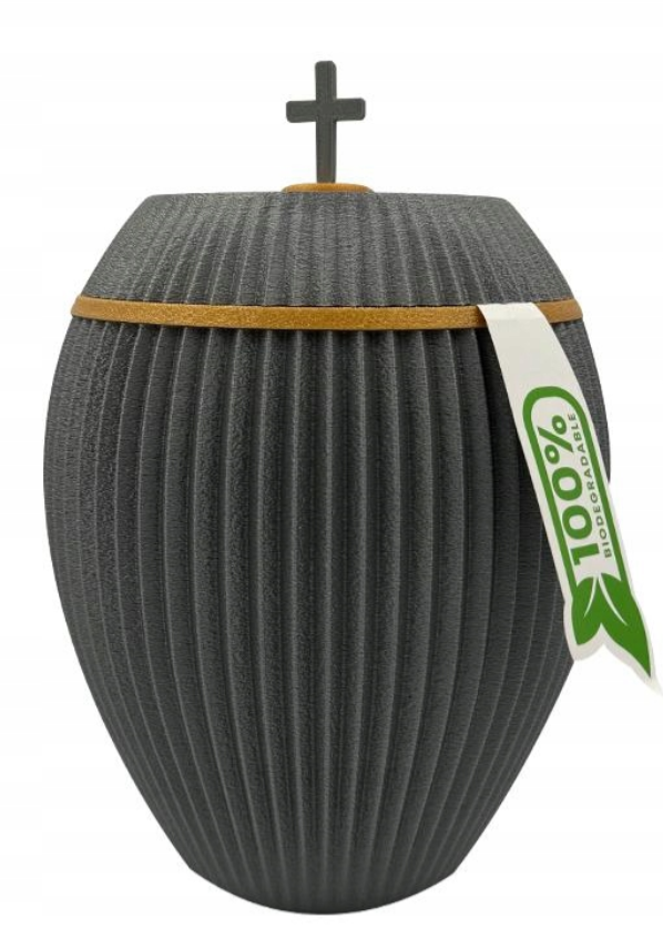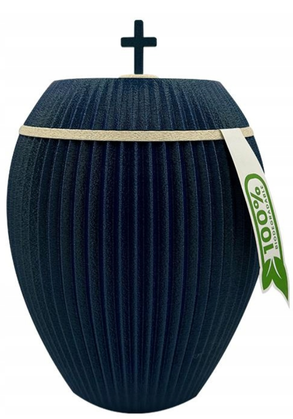 Urnan är tillverkad av biologiskt nedbrytbara material, såsom papper, kartong och naturliga fibrer, som med tiden bryts ned i naturen.